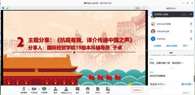 “抗疫期间你是否有为国家献出自己的一份力量呢?”19级辅导员于卓老师紧接着抛出了这一问题。在这次疫情期间,于卓老师加入了抗疫翻译志愿者队伍,常常熬夜翻译救援物资信息。她向与会同学们分享了她的抗疫翻译经历,希望通过自己的亲身经历以身作则,让更多同学懂得如何将知识化为利刃,像个战士般守护祖国。