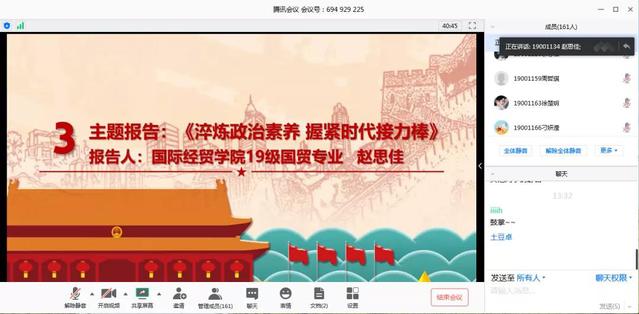 为了进一步发扬青年大学生的优良风范,推动优秀榜样引领示范的效应。本次学习活动邀请了19级国贸4班的团支书赵思佳同学作主题报告。