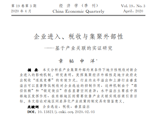 我院经济系副教授章韬老师的论文在国内权威期刊《经济学(季刊)》(Vol.19No.3)发表题为企业进入、税收与集聚外部性——基于产业关联的实证研究,章韬副教授为本文第一作者。