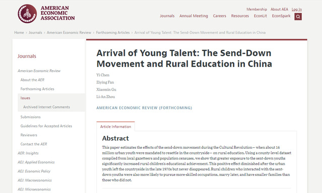 近日,国际经贸学院顾晓敏老师与合作者的研究论文Arrival of Young Talent: The Send-Down Movement and Rural Education in ChinaAmerican Economic Review(《美国经济评论》)正式接受。论文基于大量的微观数据实证考察了我国“上山下乡”运动期间知识青年对农村儿童受教育程度的影响,通过研究知青对农村教育状况的改变,探寻中国农村人力资本的大规模积累及其对后续经济增长的长期影响。