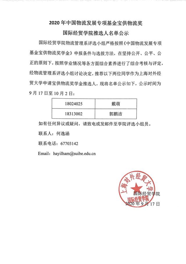 2020年中国物流发展专项基金宝供物流奖国际经贸学院推选人名单公示