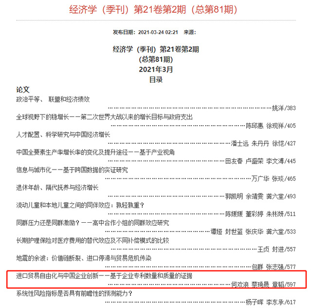何欢浪、蔡琦晟、章韬,《进口贸易自由化与中国企业创新——基于企业专利数量和质量的证据》,经济学(季刊)第21卷第2期,2021年3月