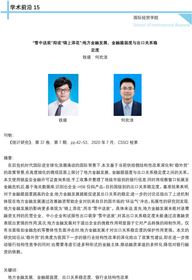 【学术前沿】 铁瑛,何欢浪:“雪中送炭”抑或“锦上添花”:地方金融发展、金融脆弱度与出口关系稳定度