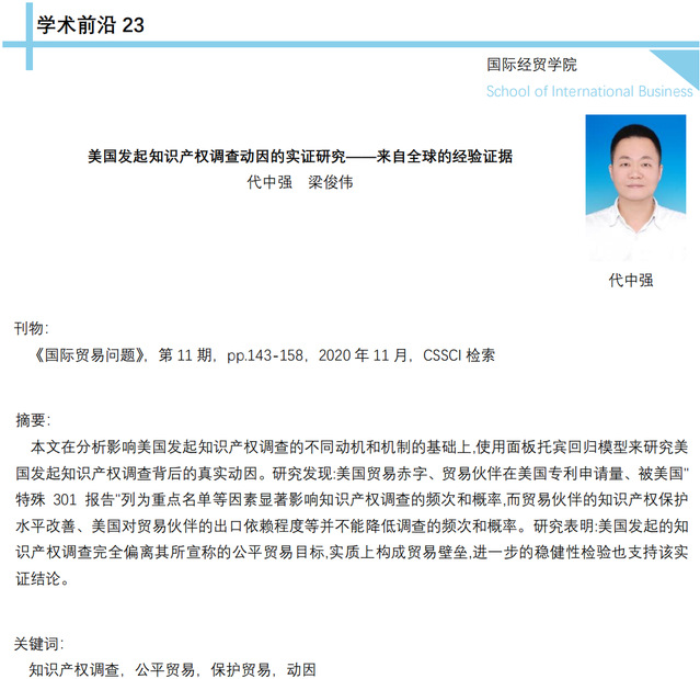 【学术前沿】代中强:美国发起知识产权调查动因的实证研究——来自全球的经验证据