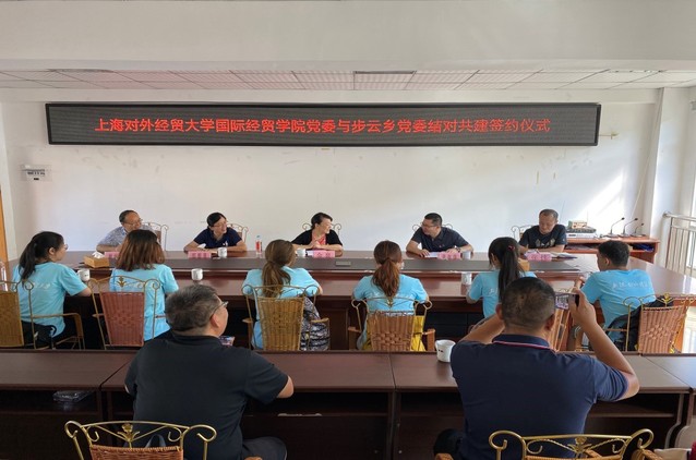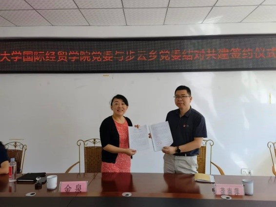 认真贯彻党的十九大和十九届二中、三中、四中、五中全会精神,以党建为引领,充分发挥学校学科优势和人才优势,实现资源共享、优势互补,积极助力国家乡村振兴战略,7月23日,必赢626net入口首页国际经贸学院党委与福建省龙岩市上杭县步云乡党委签订党组织共建协议,必赢626net入口首页国际经贸学院党委书记金泉,副书记邵雅菁,电子商务系党支部书记苏庆新和支委赵婉鹛,行政党支部书记、院兼职组织员商炳俊以及参加暑期社会实践项目的学生出席签约活动。