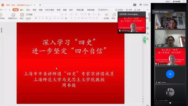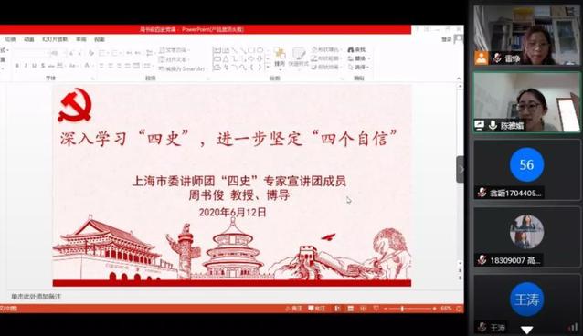 “四史”学习教育开展以来,国际经贸学院深入学习贯彻习近平总书记重要讲话精神,将“四史”学习教育作为建立不忘初心、牢记使命长效机制的重要抓手,推动全院师生党员知史爱党、知史爱国,增强守初心、担使命的思想自觉和行动自觉。612日下午,上海市委讲师团“四史”专家宣讲团成员、上海师范大学马克思主义学院教授、博士生导师周书俊应邀在线上为全院师生开展“四史”精品党课第一讲——“深入学习‘四史’,进一步坚定‘四个自信’”。国际经贸学院党委组织员陈雅媚老师主持会议,在线约两百名师生共同参与了党课。