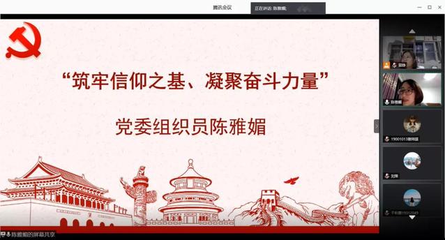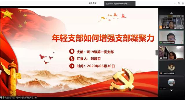 研19级第一党支部书记刘晨哲同学介绍了他所在支部的概况以及成立至今的七个月间支部开展的各项活动。随后,刘晨哲同学就支部活动的开展为大家分享经验。他先提到了一些支部建设中的难点和痛点,例如组织形式单一、同学们参与热情不够,讨论内容浮于表面等等。然后以组织过的成功案例为例,给大家提供了年轻支部开展组织活动的几点建议:党日活动形式需要不断创新,可以包括走访参观、学习政策、观看红***等;党员的理论学习需要严抓落实,力求每次学习都有收获。受疫情影响,2019学年下半学期的组织生活会开展形式受限,对此,刘晨哲同学提到,可以充分利用线上学习的优势,在主题设置时更加生活化、开放化,充分调动支部党员参与积极性,营造团结向上的学习氛围。