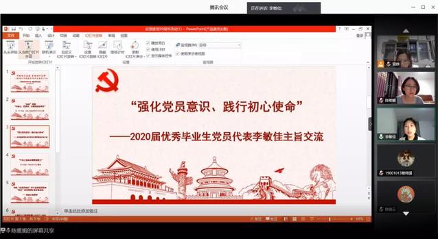 李敏佳同学作为2020届优秀毕业生党员代表和同学们交流了大学入党的经历与感悟。入学之初,她就确立了入党目标。“牢固树立思想信念,提升思想认识,绝非一日之功。”在思想方面,李敏佳同学积极参与党建知识竞赛、“不忘初心、牢记使命”主题活动等,坚持理论学习,保持思想上的先进性。她注重理论自学,拓宽理论学习的广度。“一语不能践,万卷徒空虚。”在工作中,李敏佳同学一丝不苟地对待支部团员的团课学习等基础团务工作,积极抓牢支部凝聚力建设,营造良好的支部学习氛围,带领支部在团日活动中多次获奖。在思想、工作、学习等方面,她始终以一名党员的标准严格要求自己,践行初心与使命。“初心和使命不仅是一种观念、情感、责任和义务,更是坚持不懈、脚踏实地、全心全意为人民服务的实践行为。”众志成城的抗疫斗争使李敏佳同学对“初心使命”有了更深的感悟。