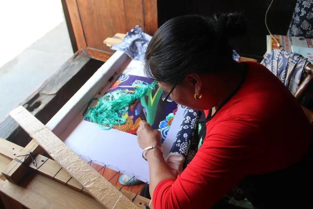 年纪大点的绣坊成员都是从小就开始学的,12岁就绣花了,现在平均年龄都是五六十了。石女士告诉我们以前苗族姑娘嫁人,新衣服都是自己绣的,而改革开放后,大家都喜欢穿简单便捷的衣服,那时候绣的人就不多了。“现在我们苗族的手工艺又因为国家重视苗族文化这种非遗手工艺,大家又开始做了。在14年的八月份就把我们的苗绣合作社组织起来了,大家又捡起民族手工艺了。”这是精准扶贫对她们的帮助,也是她们为精准扶贫做出的努力。