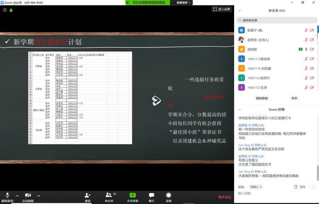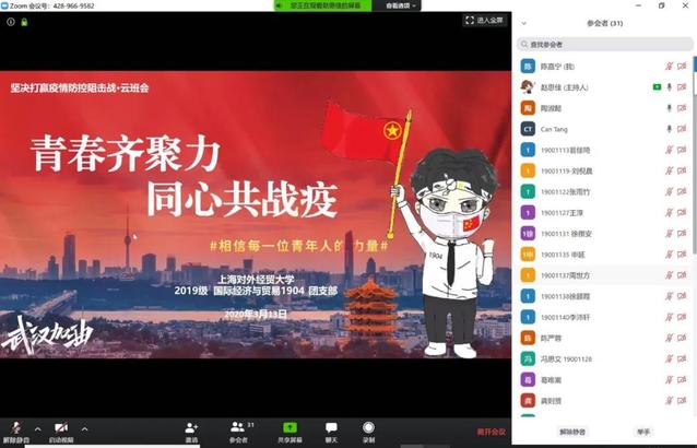 2020年3月13日下午13点,国贸1904的全体同学在这个“防疫”的特殊时期,迎来了一次温暖的聚会,以“青春齐聚力,同心共战疫”为主题召开了本学期第一次线上云班会暨支部大会。