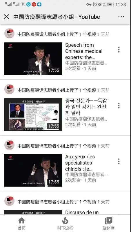 疫情期间,于卓老师加入了中国防疫翻译志愿者小组。这是一个临时成立的无报酬多语种翻译组织,其中不乏有非常权威的专业医生、翻译家和语言工作者。其中,翻译志愿工作主要负责翻译和疫情相关的各类材料,这些文件基本来源于公益机构或者相关政府单位。翻译志愿者们通过将相关抗疫类中文材料,诸如中国抗疫经验视频等内容翻译成英文材料,在专门的官方渠道面向国外华人和外国友人,进一步传播中国声音,分享中国真实的抗疫情况。