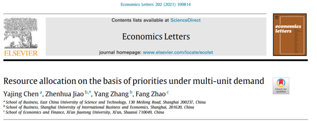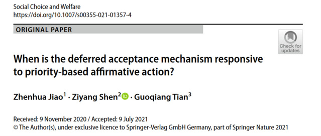 我院焦振华教授2021年在Journal of Mathematical Economics, Social Choice and Welfare等国际学术期刊围绕资源配置中的机制设计等问题发表4篇科研论文。