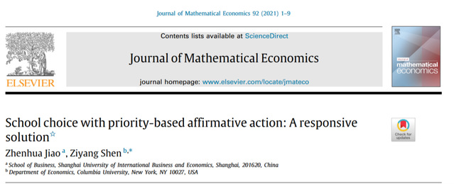 论文“School choice with priority-based affirmative action: A responsive solution”在Journal of Mathematical Economics以该刊2021年首期首篇论文(leading article)正式发表。Journal of Mathematical Economics是数理经济学国际一流期刊,该刊创立于1974年,诺贝尔经济学奖得主Alvin E. Roth,Lloyd S. Shapley,Paul R. Milgrom等人的诸多重要研究成果曾在该刊发表。焦振华教授的合作论文研究了择校匹配问题中的机制设计问题。对于择校匹配问题,当考虑对少数民族学生采取照顾性的平权政策时,现有的匹配机制均难以保证实现理想的政策效果。基于这一现状,焦振华教授及合作者设计了基于经典的延迟接受算法的迭代调整匹配机制,并论证了新设计的匹配机制下能够确保平权政策较好地实现政策目标。