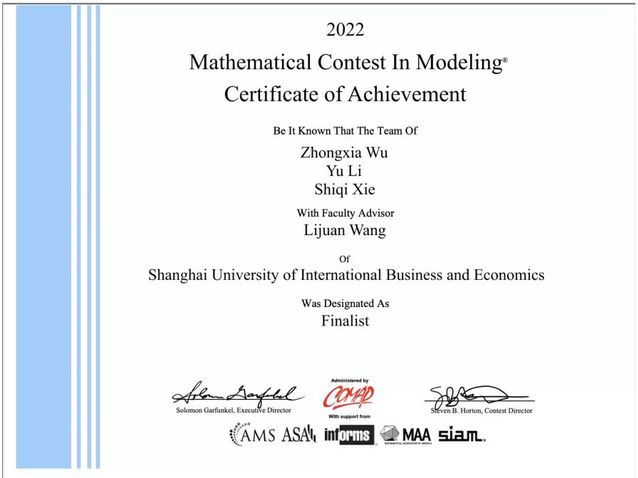 近日,2022年第38届美国大学生建模竞赛(MCM/ICM)成绩揭晓,国际经贸学院李宇(19级电子商务)、吴中霞(19级电子商务)、谢师琪(19级国际经济与贸易)3名学生组成的团队,获国际特等奖提名奖(Finalist)1项,排名为前0.27%,是我院学生参赛以来的最好成绩。