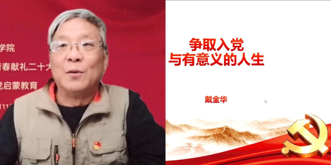 戴金华为同学们带来了题为“争取入党与有意义的人生”的专题党课,从“中国共产党为什么行?”、“什么是有意义的人生?”到“什么是更有意义的人生?”,在引经据典、阐释理论的基础上,饱含着层层递进的问题意识,融入了老党员同志的丰富人生阅历,深入浅出、娓娓道来,引导广大新生积极向党组织靠拢,聚集在中国共产党的党旗下,投身党领导的伟大事业中,鼓励广大新生追求个体需要与社会需要、自我需要与为他需要的统一,追求有信念、有梦想、有奋斗、有奉献的人生,在实现中华民族伟大复兴的宏伟事业中,获得个人发展与价值实现。
