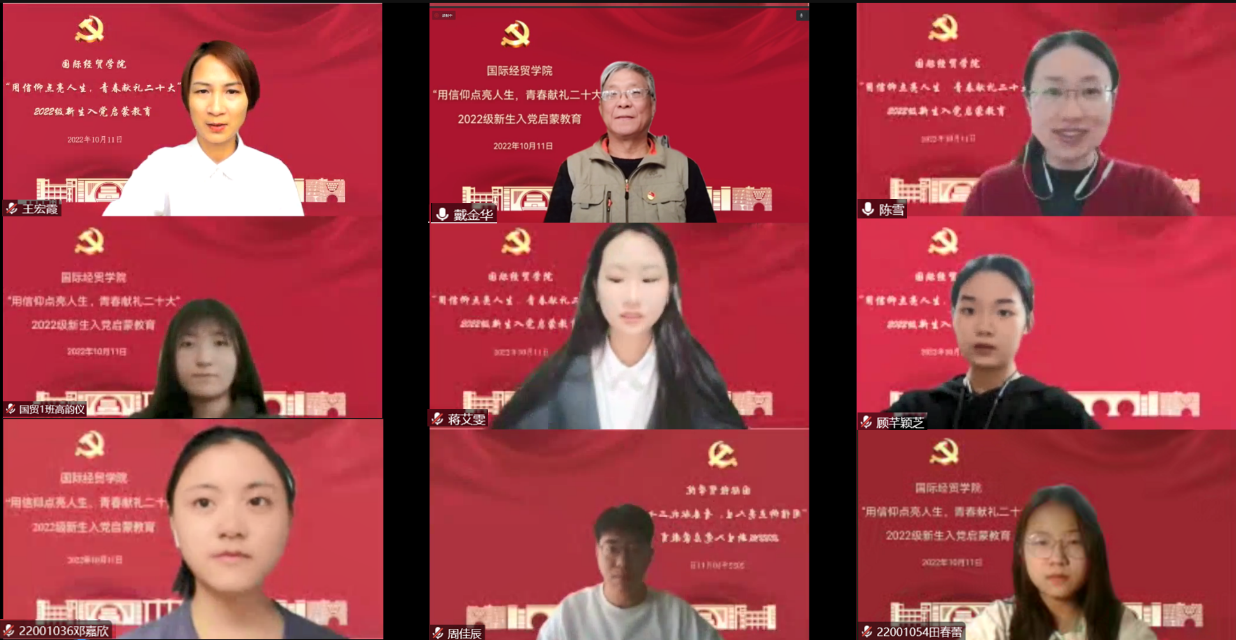 为进一步增强2022级学生对党的认识,引导同学们坚定理想信念,端正入党动机,积极向党组织靠拢。1011日下午,国际经贸学院党委在线上平台组织开展2022级新生入党启蒙教育,邀请校关工委委员戴金华讲授专题党课。学院党委副书记陈雪、专职组织员、学生党建主管和研究生、本科生新生代表共100余人参加。活动由学院党委副书记陈雪主持。