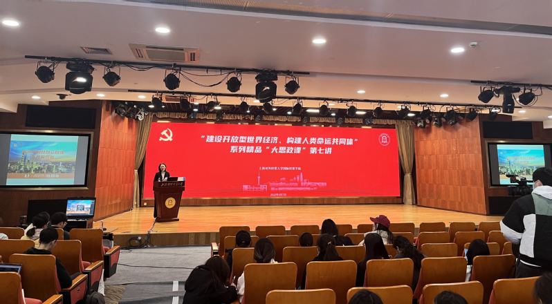 37日下午,“建设开放型世界经济、构建人类命运共同体”系列精品“大思政课”第七讲在松江校区信息楼507报告厅举行。国际经贸学院副院长沈克华主持,学校官方微信视频号同步线上直播,学院师生及校内外3800余名观众共同聆听。