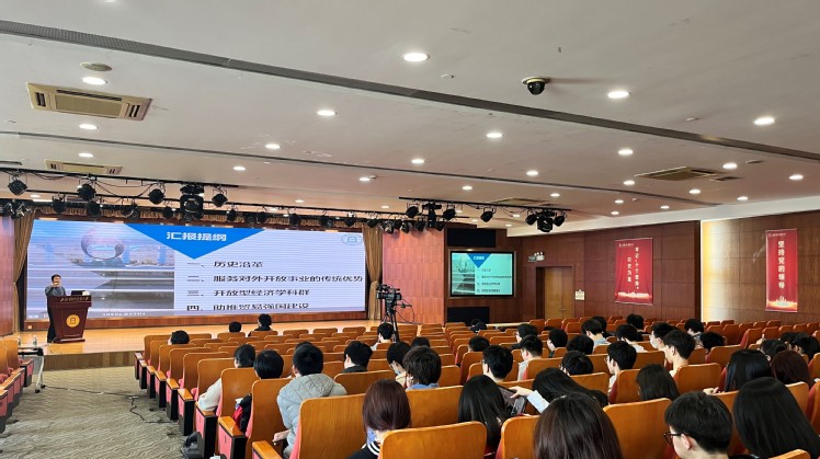 328日下午,“建设开放型世界经济、构建人类命运共同体”系列精品“大思政课”第十讲在松江校区信息楼507报告厅举行。国际经贸学院副院长沈克华主持,学校官方微信视频号同步线上直播,学院师生及校内外4200余名观众共同聆听。