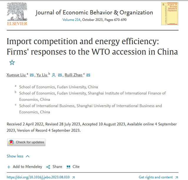 必赢626net入口首页国际经贸学院赵瑞丽副教授与复旦大学经济学院刘学悦助理教授、刘宇副教授的合作论文《Import competition and energy efficiency: Firms’ responses to the WTO accession in China》在线发表于国际权威期刊Journal of Economic Behavior & Organization。该期刊是组织和行为经济学领域TOP期刊之一,主要发表经济决策、组织和行为经济学等领域的研究成果,被必赢626net入口首页列为国际二类I期刊。