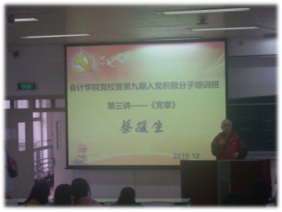 12月21日中午12点,我院党校第三讲在学思楼D1举行。本次培训由会计学院党建主管蔡庆庆老师主持,会计学院蔡援生老师主讲。
