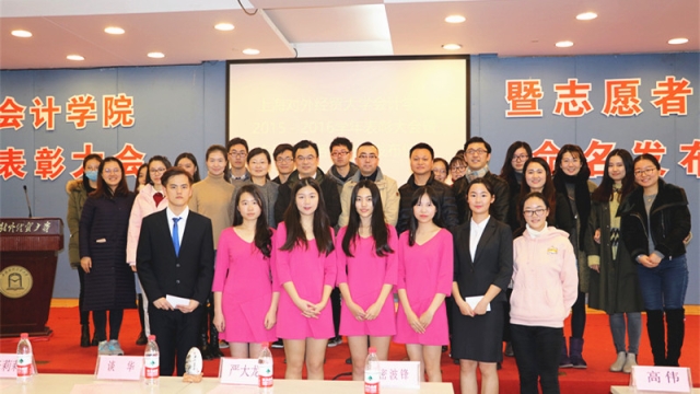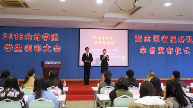 会计学院2016年学生表彰大会暨志愿者服务队命名发布仪式于12月22日中午在信息楼526举行。学工部部长严大龙、会计学院党委书记谈华、会计学院党委副书记张莉莉、国际经贸学院FUTURES工作室指导老师高伟、上海立信会计金融学院创业学院主管密波锋以及各学院的团委书记和副书记等出席了本次表彰大会。