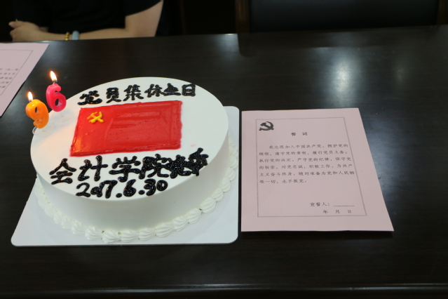 630日下午13点,为庆祝建党96周年,强化党员宗旨意识,会计学院教工第三党支部在校工会会议室开展党员集体过一次“政治生日”、佩戴党徽重温一次入党誓词、公开承诺亮一次党员身份、送一份礼物观看电影党课的“四个一”党日活动,将共产党员政治生日纪念活动与开展亮身份、树形象、做实事、比贡献主题活动结合起来,落实“两学一做”学习教育的常态化制度化。支部全体成员及新进发展的预备党员学生代表参加了此次活动。