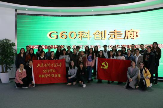 20181130日中午为深入学习贯彻落实党的十九大精神,走发展最前沿,了解创新第一线,会计学院本科学生党支部党员和学院积极分子在支部书记陈晶晶老师的带领下前往漕河泾科技园参观G60上海松江科创走廊”规划展示馆部分研究生党员也随同一起参加了本次活动