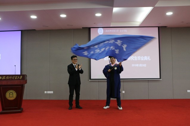 典礼由200多名毕业生在校照片制作而成的毕业视频拉开帷幕。程安林副院长宣读了学院获得硕士学位名单、学校和上海市优秀毕业生名单、优秀学位论文名单。谈华书记向2019届会计学院研究生校友分会进行了授旗。