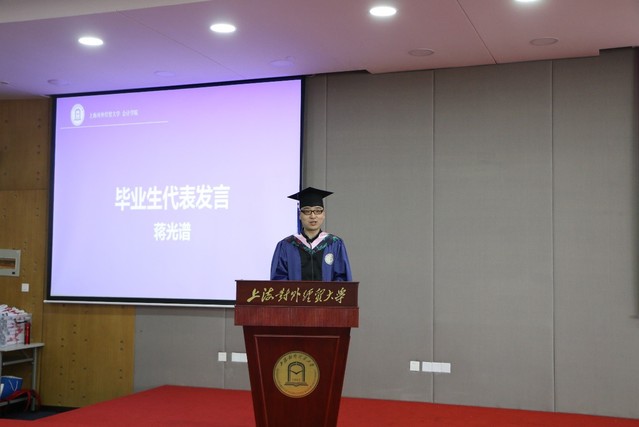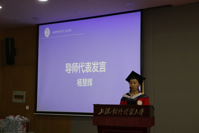 毕业生代表蒋光谱同学分享了自己两年来的学习、工作上的收获,表达了对学校、导师、同学和父母的感恩。学院杨慧辉副教授作为教师代表,勉励同学们继续钻研问题刻苦奋斗,始终做一个品德高尚追求崇高的人。会计学院院长李婉丽在发言中,对同学们在校期间的学习成果予以肯定,鼓励同学们在社会工作中再接再厉,实现人生价值推动社会发展奉献国家建设。