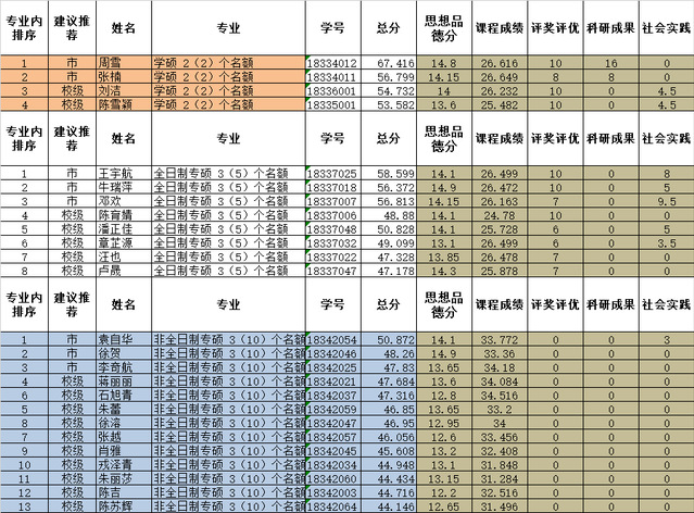 公示期间,经反馈,部分同学评奖评优分数超过细则规定上限10分,因此调整后,涉及到两位同学:学硕 张楠调整为市优毕,学硕 刘洁调整为校优毕。