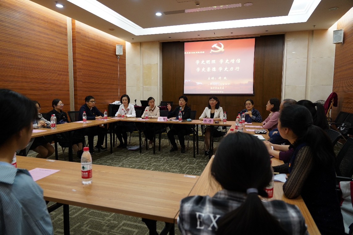 参观完毕,许玫带领师生党员重温入党誓词,进一步坚定理想信念,增强党员使命感、责任感。并讲授题为《学史明理、学史增信、学史崇德、学史力行》的微党课。许书记与大家分享了中国会计博物馆筹建过程中难忘的小故事,强调会计在人类历史发展中发挥的重要作用,尤其在我们党的发展历史与新中国建设过程中,会计都发挥举足轻重的作用,希望会计学院的广大师生党员能够在历史中汲取力量,立足本职工作,从前辈身上学到胸怀国家、兼济天下的大智慧。会计学院党员师生以及会随同前往的校纪委办同志就参观的感受和学习的心得展开了热烈的讨论,大家纷纷表示从会计的发展史中感受到了传承和创新的力量,也深刻感受到一代代会计人勤奋扎实、诚信守纪的奋斗精神。