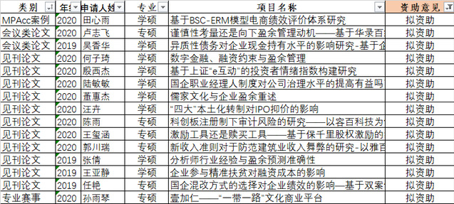 按照我院《关于会计学院“毓秀计划”创新项目申报启动的通知》和《会计学院“毓秀”研究生创新项目资助计划实施办法》,经学生个人申请,学院组织校外专家进行双盲评审,拟立项15项如下: