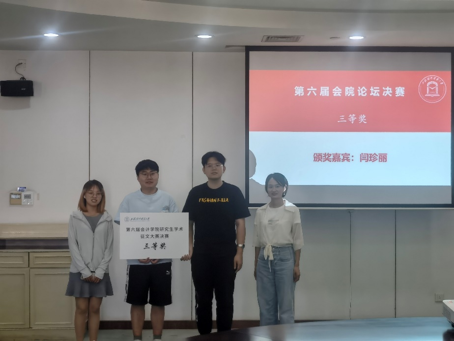 为进一步营造浓厚的研究生科研创新氛围、强化研究生创新意识、应用创新能力、学术思维和研究水平,会计学院于6月23日下午,在信息楼501圆形报告厅隆重召开第六届“学术为魂,见证未来”会院论坛学术征文大赛决赛暨 “毓秀”研究生创新项目资助计划立项颁证仪式。会计学院副院长杨慧辉教授、审计系副系主任陈丽英副教授、会计系教工党支部书记何开刚博士、青年教师闫珍丽博士、以及研究生会书记谭海桢老师出席本次活动。