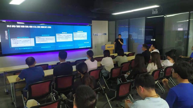 在浪潮(上海)数据双创中心与云计算创新中共新的授课教室,ERP解决方案售前总赵辉给来访师生进行了智能财务的理论思维、硬件设施和发展前景做了讲授,从80年代第一家财务共享服务中心建立,到2012年的财务共享建设热潮。如今,各大型企陆续开始进行财务变革,建设自己的财务共享服务中心。然后,通过中交建财务共享中案例详细讲述集团企业需要什么样的财务共享服务中心这一问题。并对未来财会相关专业同学的专业知识、技能学习提出了他的建议。