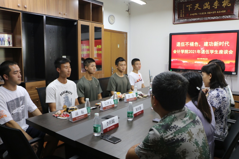 9月26日中午,学院在博识楼346举行“退伍不褪色,建功新时代”2021年退伍学生欢迎会。党委书记张嵘、副书记张晴晴、辅导员朱红艳、李钦儒、何佩文和5名退伍学生出席。