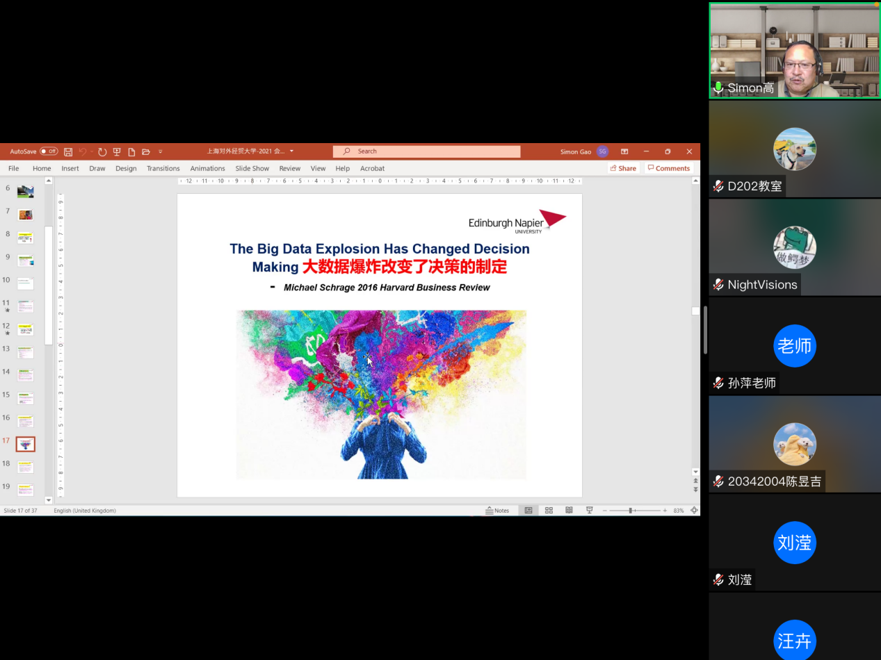 10月13日晚上,爱丁堡龙比亚大学商学院高善生教授在英国苏格兰的爱丁堡通过腾讯会议面向我院2021级研究生新生开展了一场主题为“大数据时代会计的发展与未来就业思考”的学术讲座。学院2021级全日制研究生在学思楼C202、非全日制研究生在云端,共同聆听了这场讲座。