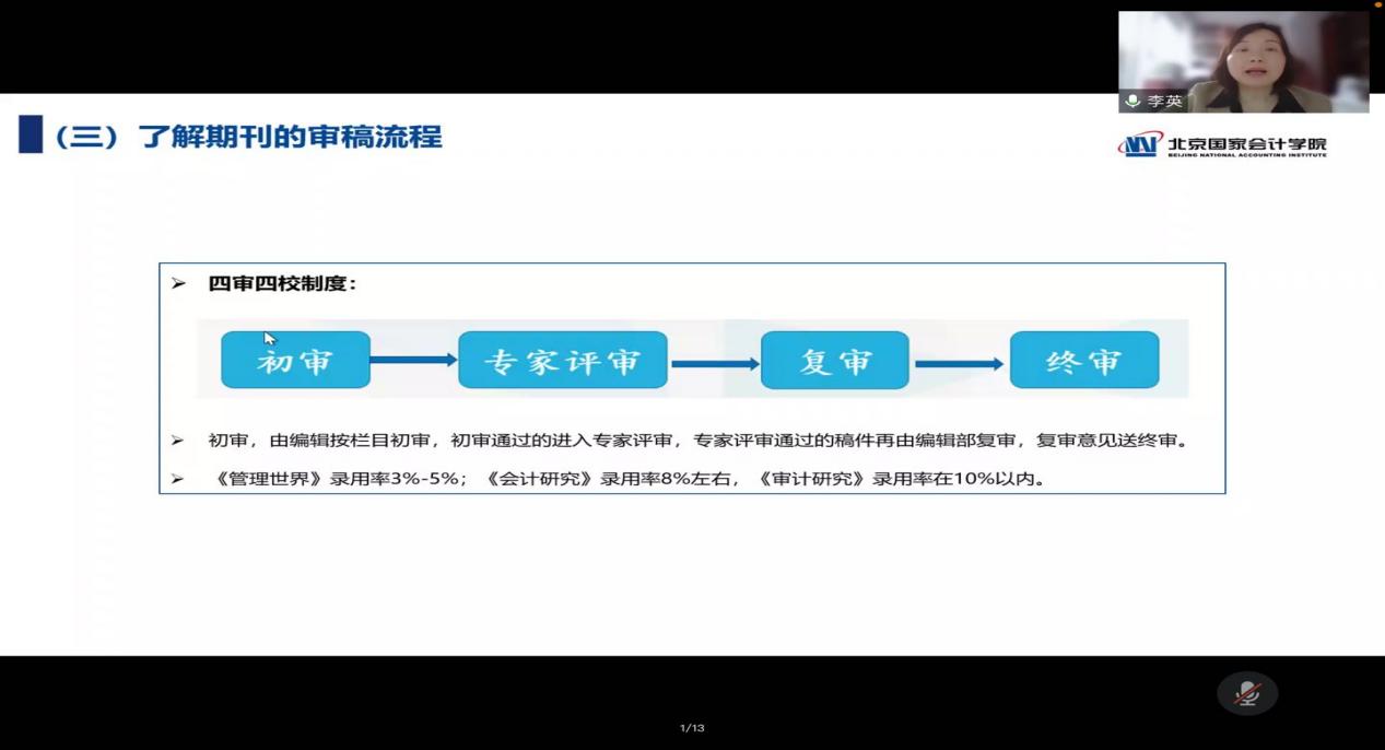 1116日下午,北京国家会计学院副教授、硕士研究生导师李英通过腾讯会议面向同济大学经济与管理学院学生和我院研究生开展了一场主题为会计理论创新的学术讲座本次讲座是财会审智能化推进联盟单位之间的优质讲座资源共享,学院研究生在线聆听了这场讲座。本次讲座内容围绕会计理论研究时代背景、基础科学进步与会计理论创新、会计理论和方法体系的反思、选题设计和提高投稿命中率的技巧五个方面展开。