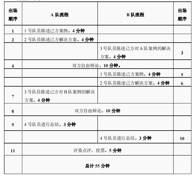 2.复赛内容:晋级复赛的6支队伍通过抽签两两分组,一对一淘汰。3组队伍轮流进行比赛,分组双方需提前3天互相研究、分析对方在初赛提交的案例及解决方案,并就对方案例提出己方的解决方案,双方通过现场陈述与辩论展现自身能力水平。