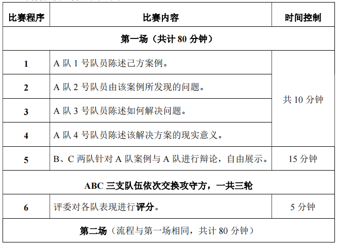 决赛前2天,参赛队伍通过抽签确定主客顺序,承办单位向各队伍提供比赛用案例。决赛当天,三支队伍同时上场,一主两客,主队陈述,客队提问,主队回答,循环三轮,比赛结束。