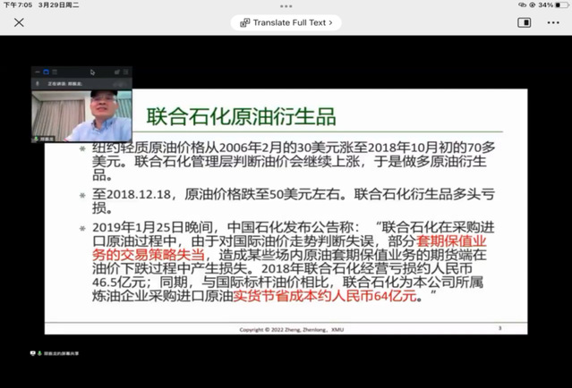 3月29日晚,厦门大学管理学院财务学系郑振龙教授应邀为上海国家会计学院和我院研究生开展了主题为“金融衍生品与套保”的学术讲座。郑振龙教授是享受国务院政府特殊津贴,国务院学位委员会第六、七届应用经济学学科评议组成员,国家“万人计划”哲学社会科学领军人才,厦门大学证券研究生中心主任,兼任中国金融学年会秘书长、中国金融学会常务理事兼学术委员、郑州商品交易所理事会咨询顾问委员会委员、中国金融期货交易所风险委员会委员等职。