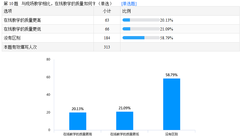 学生们普遍认为“腾讯会议”是效果最好的在线教学平台。44.4%的学生认为他们上课开摄像头的意愿较低的最主要原因是“蓬头垢面,形象不佳”。对于“与现场教学相比,在线教学的质量如何?”这一问题,58.79%的学生们认为两者没有区别,20.13%的学生们认为在线教学的质量更高,21.09%认为现场教学的质量更高。