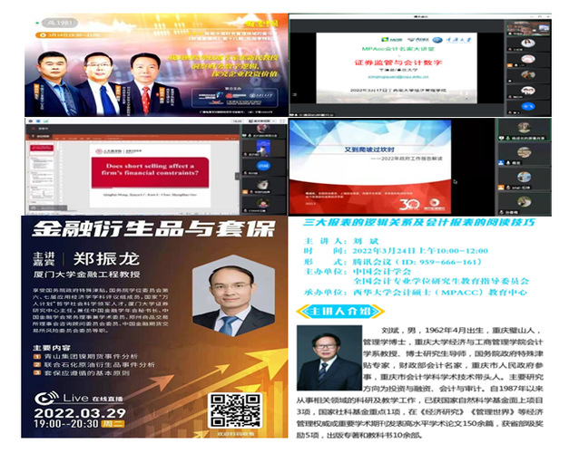 强化协同育人机制,研究生云端第二课堂有名堂。通过“MPAcc大讲堂”、“案例开发工作坊”等平台,赋能科研育人和产教融合,积极开展多层次的线上云端学术活动。自2022311日至今,学院共开展线上讲座6场。来自中国人民大学、西安交通大学、厦门大学、重庆大学的资深教授和来自上海申银万国证券研究所有限公司等我院MPAcc行业产业导师的讲授,突破了地域和空间局限,形式新颖、开放包容,为研究生提供更多与会计知名学者和实务界专家学习、交流的机会,分享了知识的饕餮盛宴,营造了促进学术创新、加强科研合作、积极产出成果的良好氛围。