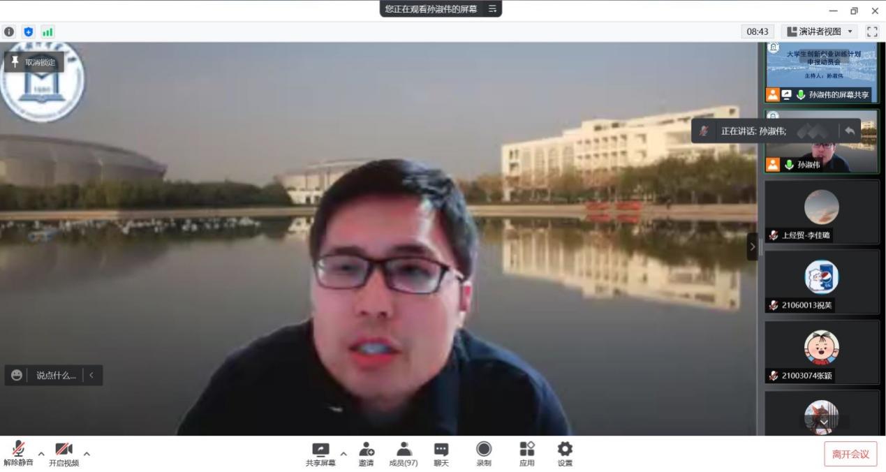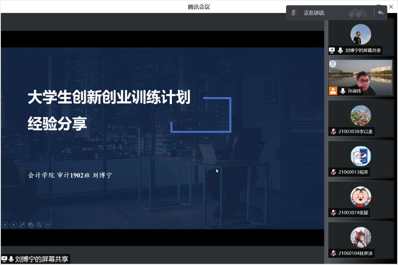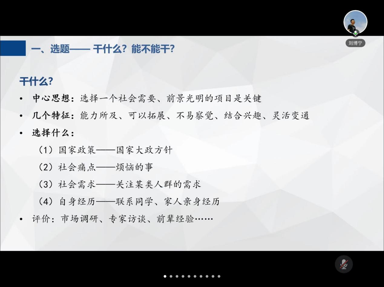 优秀创新创业项目主持人、国家级创新创业项目组长,2019级本科刘博宁同学从选题技巧、团队建构、计划书撰写和项目可持续性等方面做分享,建议同学们从国家政策、社会需求及专业发展等方面出发,分析研判项目可行性,为同学们提供了宝贵的选题思路。