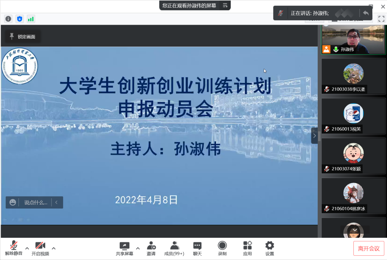 为进一步推动学院创新创业教育向纵深发展,用好云上平台,继续培养多层次、复合型、应用型财会人才, 4月8日19时,会计学院在腾讯会议云端召开创新创业训练计划申报动员会暨答疑讲座。会计学院副院长孙淑伟、会计学院党委副书记施毅婷和部分辅导员出席,动员会由孙淑伟主持,2021级、2020级全体学生和部分2019级学生参与分享会。