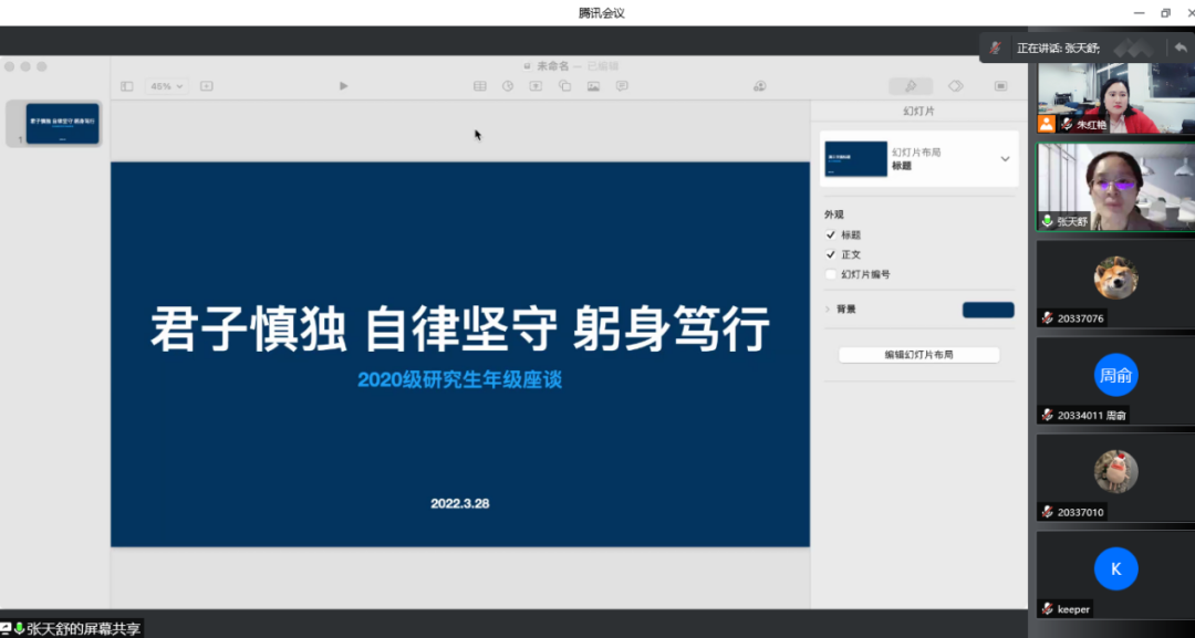 学院副院长张天舒担任2021和2020级研究生“特殊辅导员”,她结合“夯实学术研究基础”和“科研创作养成”分别给研一、研二学子召开主题教育大会。她教导学生,应做到“君子慎独,自律坚守,躬身笃行”;结合线上教学有效规划利用好这段科研“黄金时间”,增强自学能力和独立思辨能力。