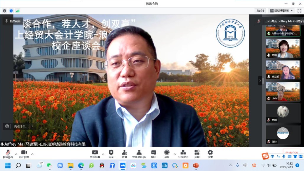 为贯彻落实党中央、国务院关于高校毕业生就业工作的决策部署,落实教育部关于全国高校书记、校长访企拓岗促就业专项行动,落实学校关于开展院长、书记访企拓岗促就业专项行动的通知,深入落实学院就业工作“一把手”工程,会计学院于5月13日,邀请浪潮集团进行了在线洽谈,双方就深化产学研合作、共同推动学生就业展开商讨。浪潮铸远教育科技有限公司总经理马建军、副总经理秦丽、副总经理陈玲、浪潮集团上海公司副总项学乐、客户经理卢筱丽,会计学院院长裴瑱教授、副院长杨慧辉教授、MPAcc中心副主任谭海桢出席了本次洽谈。