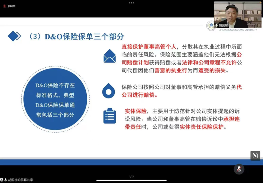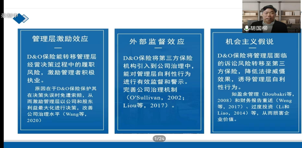 513日晚,学院全体研究生通过云端聆听了由浙江工商大学会计学院院长胡国柳教授带来的主题为“董事高管责任保险:理论研究与中国实践”的精彩的学术报告。胡国柳教授为财政部“会计名家培养工程”入选者,“百千万人才工程”国家级人选国家“有突出贡献中青年专家”、享受“国务院政府殊津贴”专家、教育部“新世纪优秀人才支持计划”入选者、“宝钢优秀教师奖”获得者。担任教育部高等学校工商管理类专业教学指导委员会会计学专业教学指导分委员会委员、中国会计学会财务管理专业委员会会员。