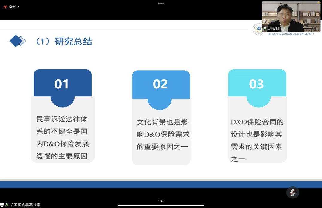 于案例分析,胡教授进行了总结与展望,他表示民事诉讼法律体系的不健全是国内D&O保险发展缓慢的主要原因,文化背景也是影响D&O保险需求的重要原因之一,D&O保险合同的设计是影响其需求的关键因素。同时,胡教授认为D&O保险在需求动因、治理效应、合同内容设计、诉讼与赔付案例等方面的研究相对不足,D&O保险在中国的认购率较低,未来仍有很大研究空间。