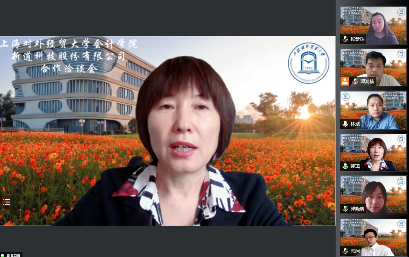 为贯彻落实党中央、国务院关于高校毕业生就业工作的决策部署,落实教育部关于全国高校书记、校长访企拓岗促就业专项行动,落实学校关于开展院长、书记访企拓岗促就业专项行动的通知,深入落实学院就业工作“一把手”工程;同时,按照财政部《会计改革与发展“十四五”规划纲要》做好人才培养共工作。会计学院于5月18日,邀请新道科技有限进行了在线洽谈,双方就深化产教融合、做好财会课程改革、协助教师科研实训、推动学生就业展开商讨。新道科技股份有限公司上海区总经理林斌、江南区副总经理钱丽、新道北京总部商科专家张娜娜、上海校企合作经理郭晓航、教学顾问刘玉、售前顾问席舸,会计学院院长裴瑱教授、副院长杨慧辉教授、MPAcc中心副主任/辅导员谭海桢出席了本次合作洽谈会。