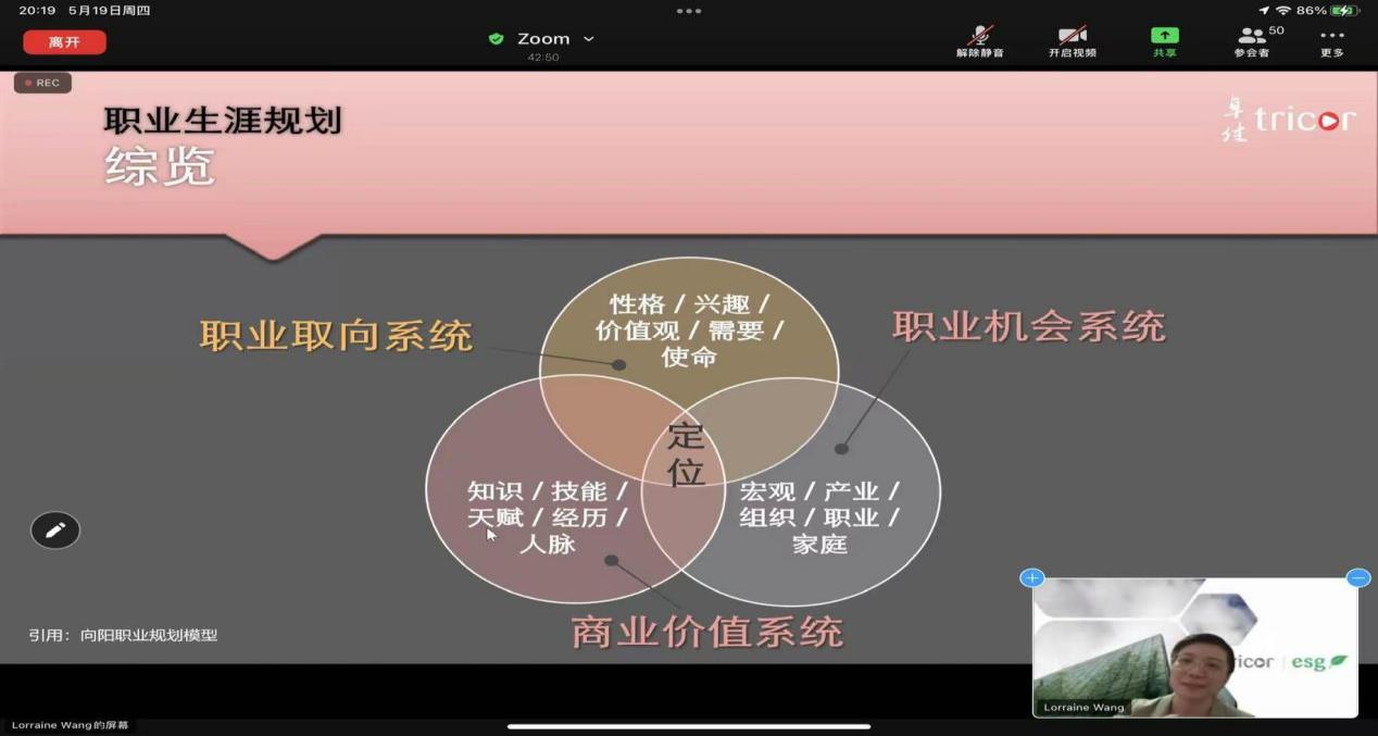 讲座伊始,王艳女士从影响世界格局变化的五大因素开始,指出当今社会各行各业变动迅速、就业环境变化多端,作为财会人员不能仅仅只满足于会计细节,而应将自己置身于宏观大环境,不断推动自己去了解业务流程和企业发展基本面。接着,王女士阐述了如何用向阳职业规划模型来做出自己的未来规划,该模型要求我们兼顾职业取向、商业价值和职业机会这三大因素,找出其中的交集,即最优质的职业规划。其中,王艳女士引用了CSRI对于Y22的六个趋势的研究报告,阐述了就业宏观背景下劳动力与资源的稀缺,指出当今社会就业压力之大,就业人才不仅要具备良好的专业素质,还应该提升对于信息技术和数据技术的敏感。